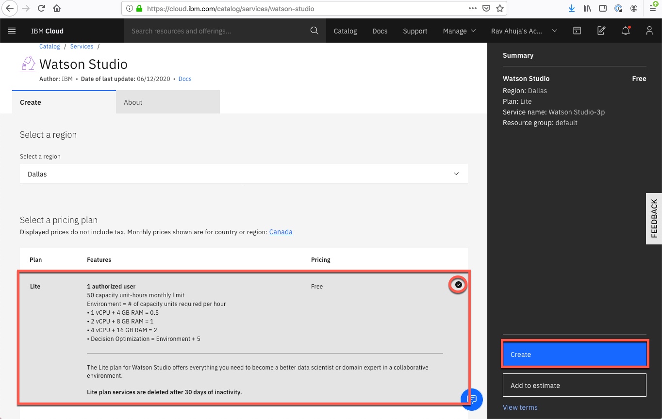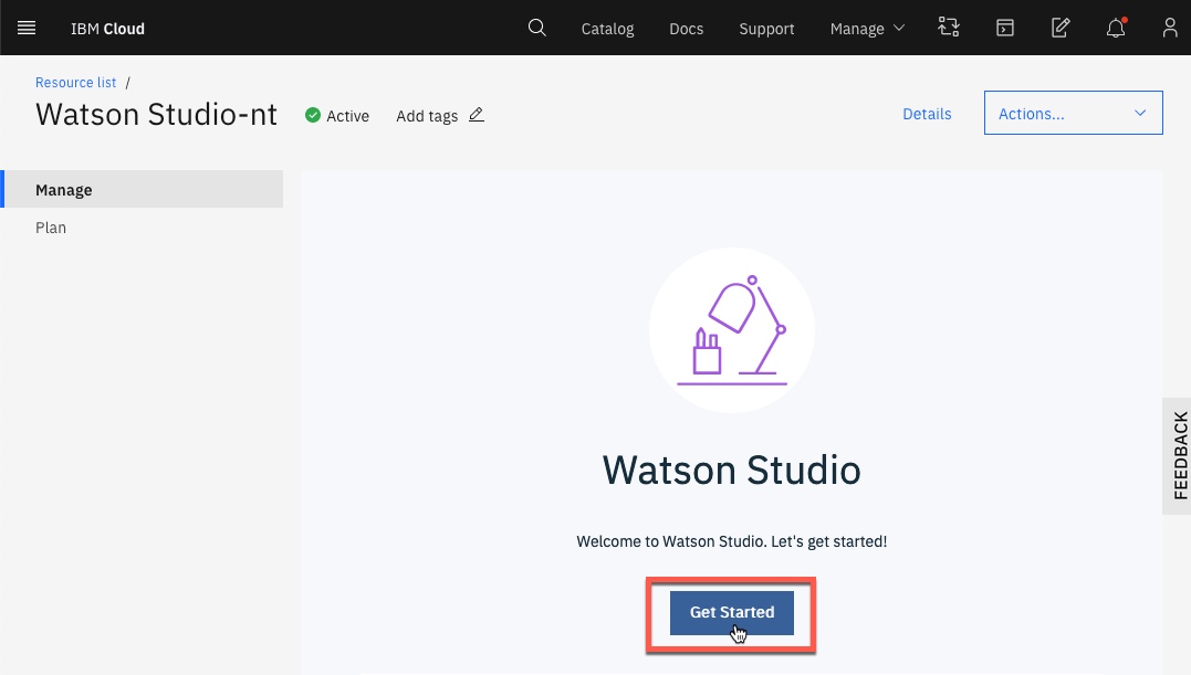 Watson Studio, which is available as a service on IBM Cloud, and a component of the IBM Cloud Pak for Data, allows you to build and collaborate on AI and Data Science projects. In this exercise, you will add an instance of the Watson Studio service to your IBM Cloud account.